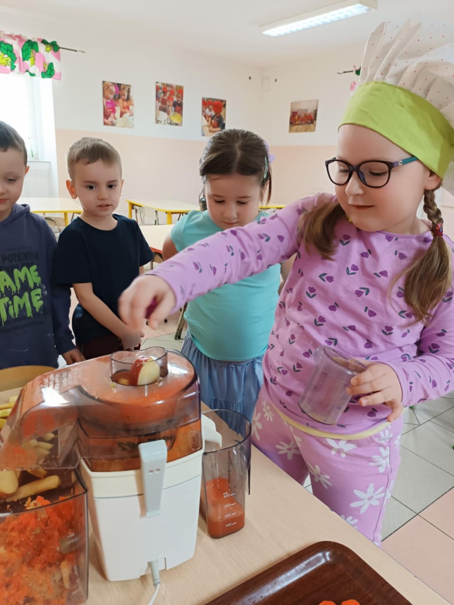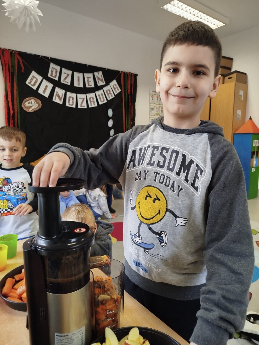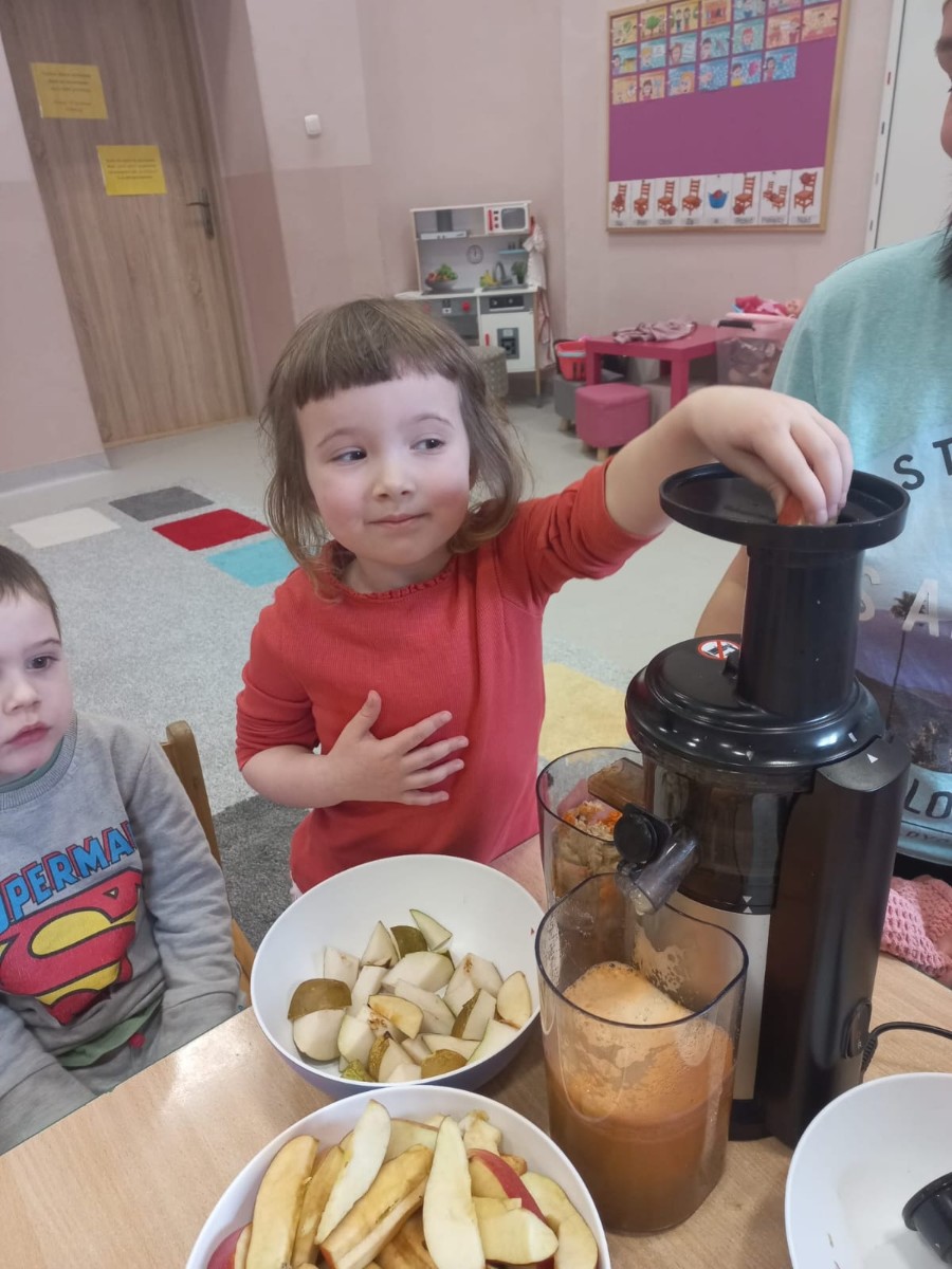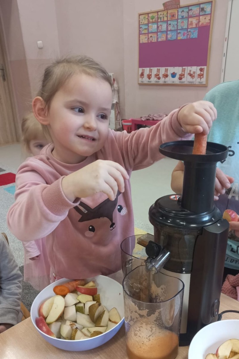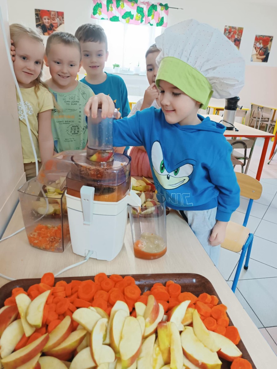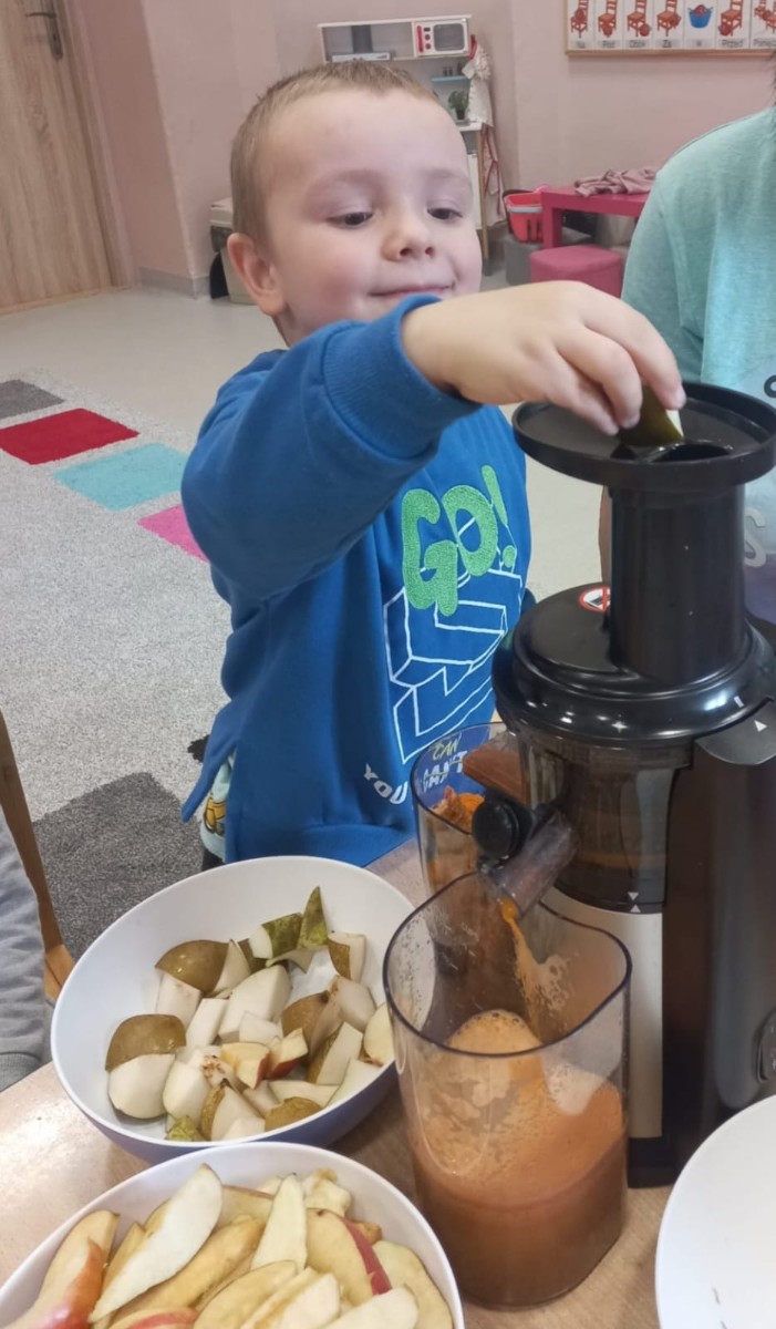 Dzieci samodzielnie, higienicznie i bezpiecznie wykonały soki warzywno- owocowe, które ze smakiem i uśmiechem wypiły. Polecamy