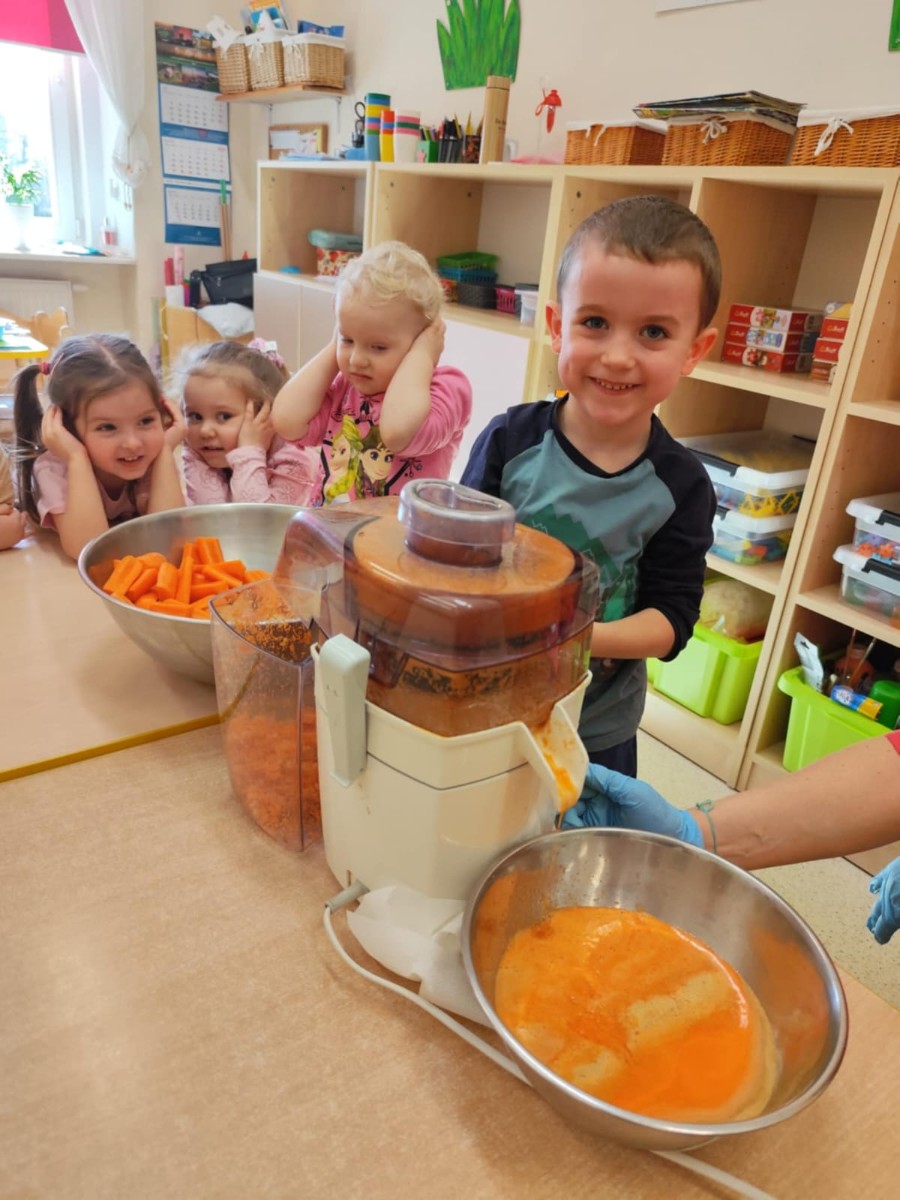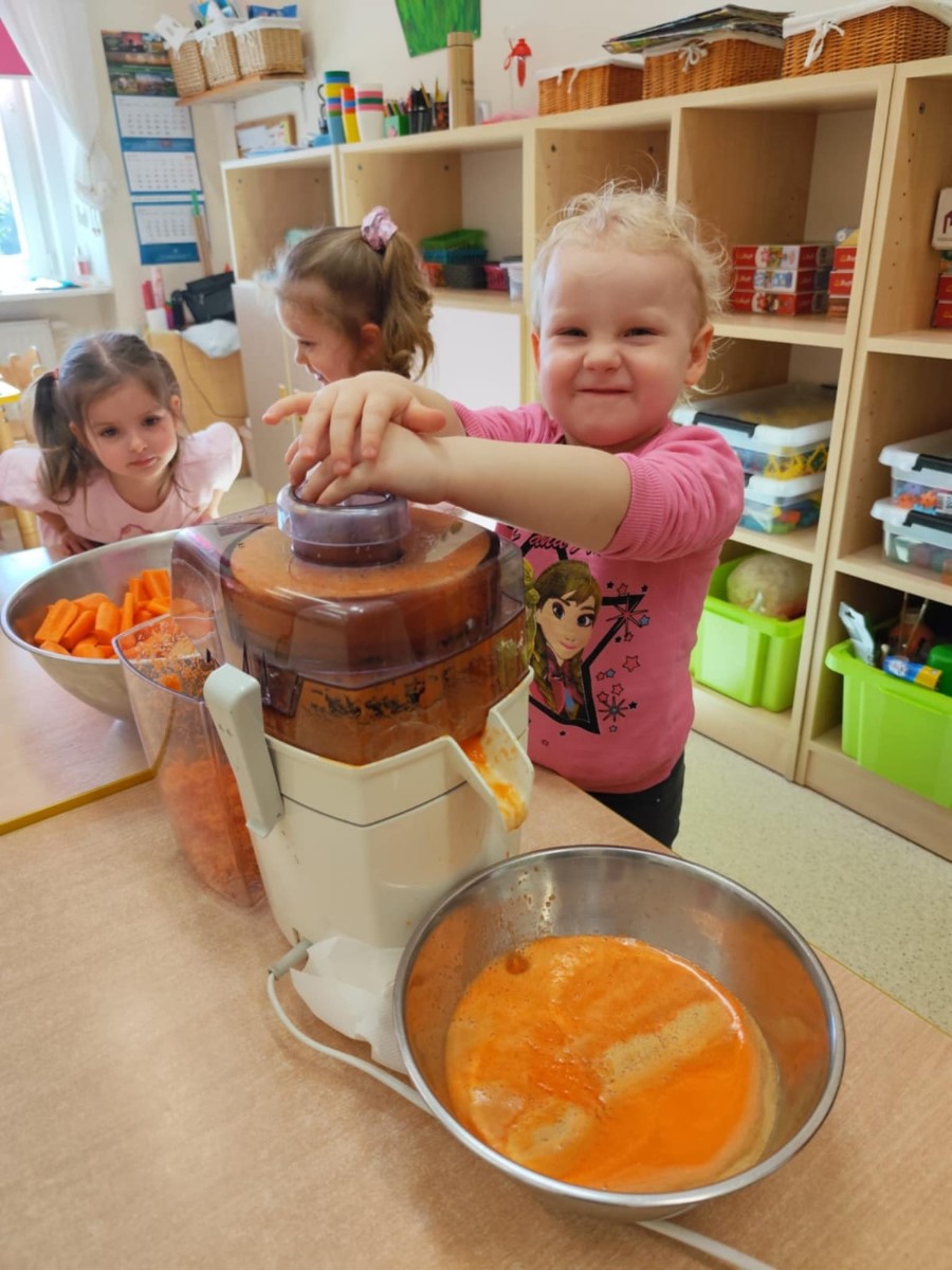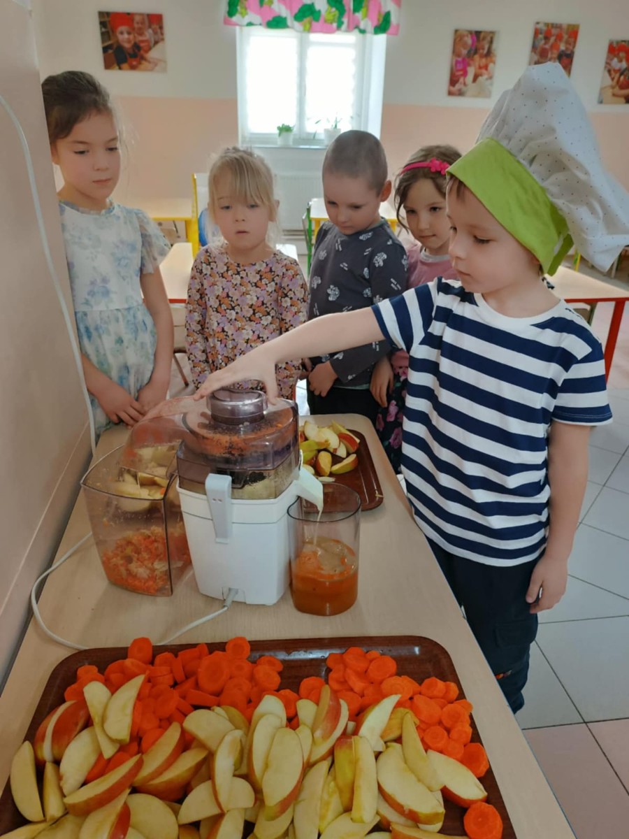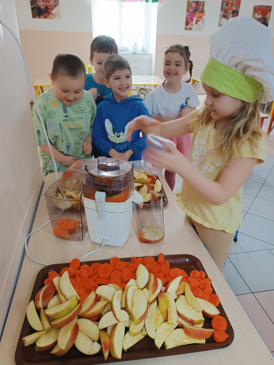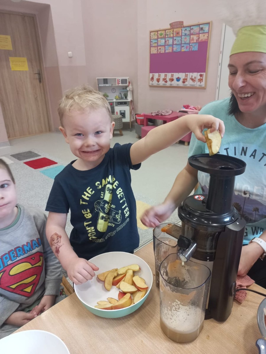 Dzieci samodzielnie, higienicznie i bezpiecznie wykonały soki warzywno- owocowe, które ze smakiem i uśmiechem wypiły. Polecamy