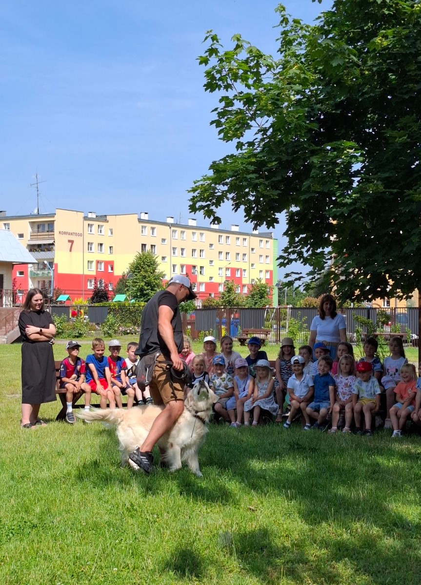 Podczas spotkania dzieci z ogromnym zainteresowaniem obserwowały pokaz sztuczek, posłuszeństwa oraz umiejętności poszukiwawczych naszego czworonożnego bohatera. Pies nie tylko zachwycił wszystkich swoją sprawnością i opanowaniem, ale również pokazał, jak ważną rolę odgrywają psy w działaniach ratowniczych.