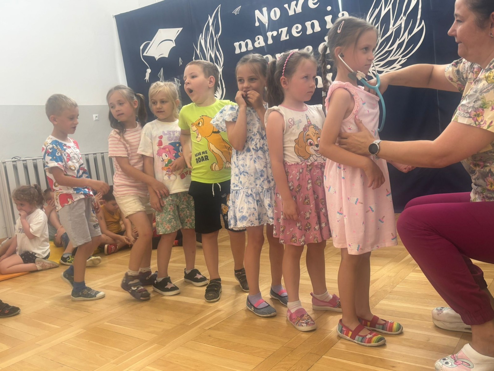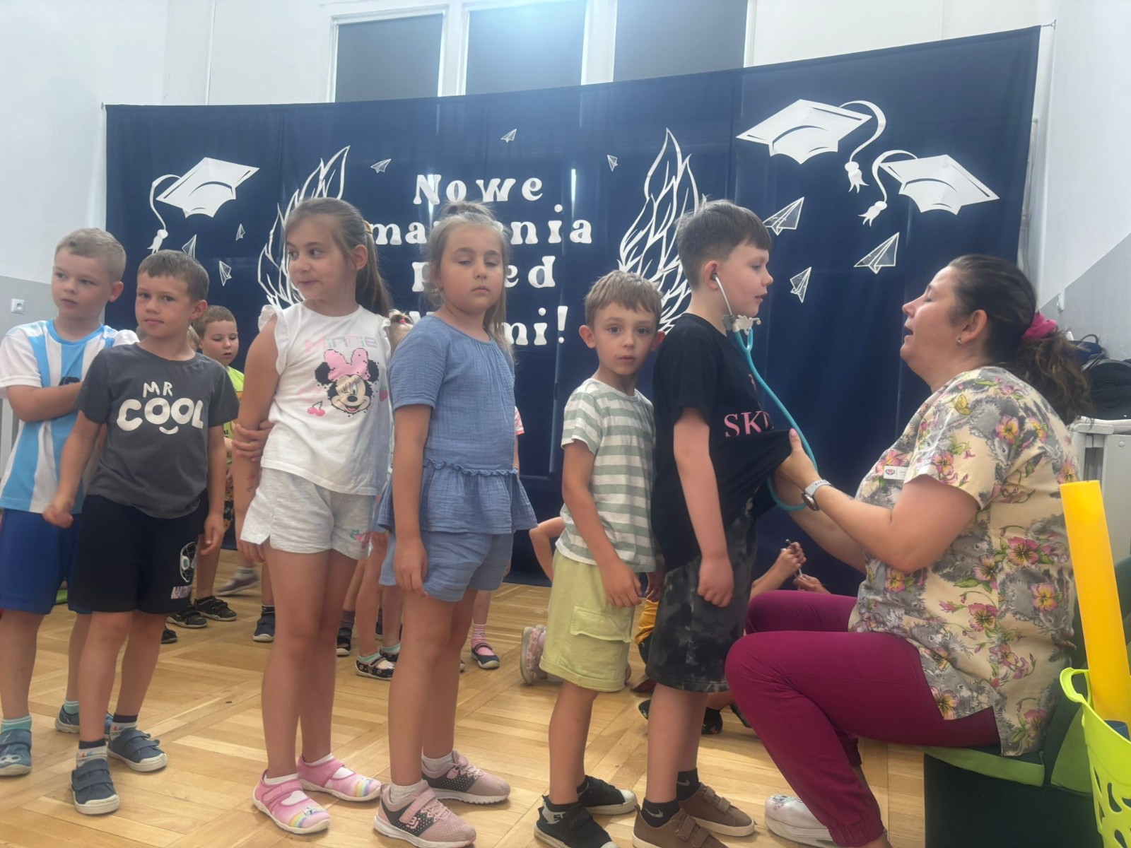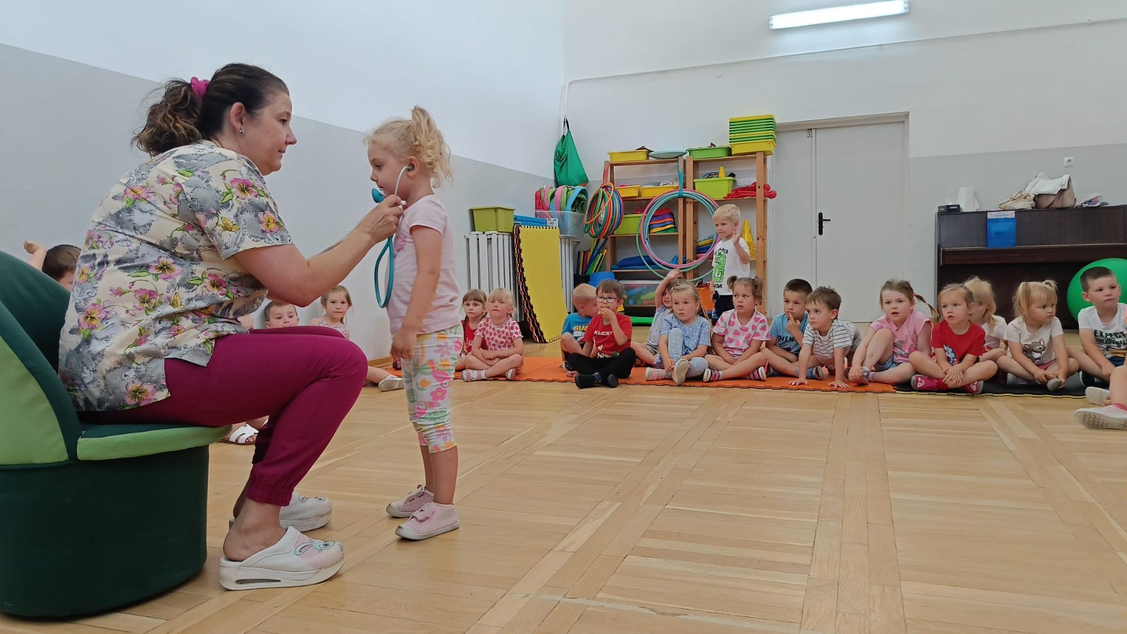 Kolejnym punktem programu była krótka gimnastyka, która miała na celu pokazanie dzieciom, jak ważne jest utrzymywanie aktywności fizycznej w codziennym życiu. Po ćwiczeniach przyszedł czas na prawdziwe „medyczne atrakcje”.