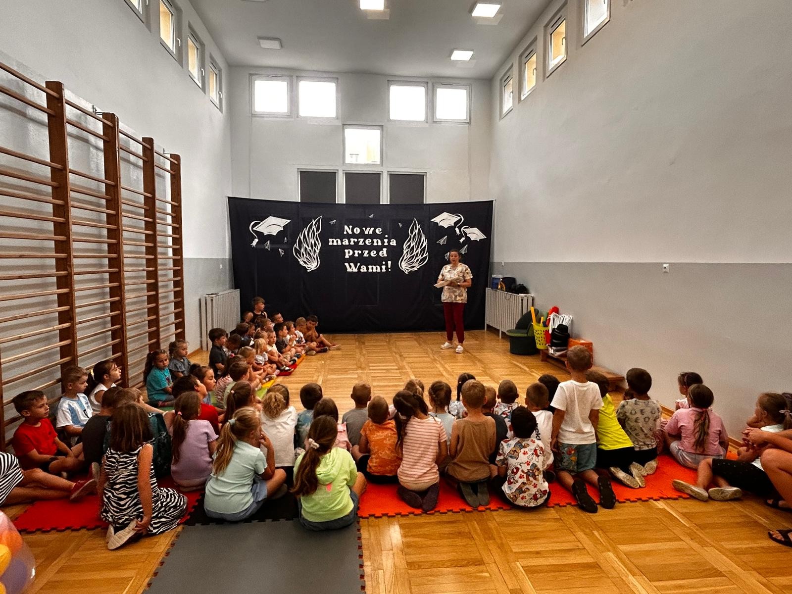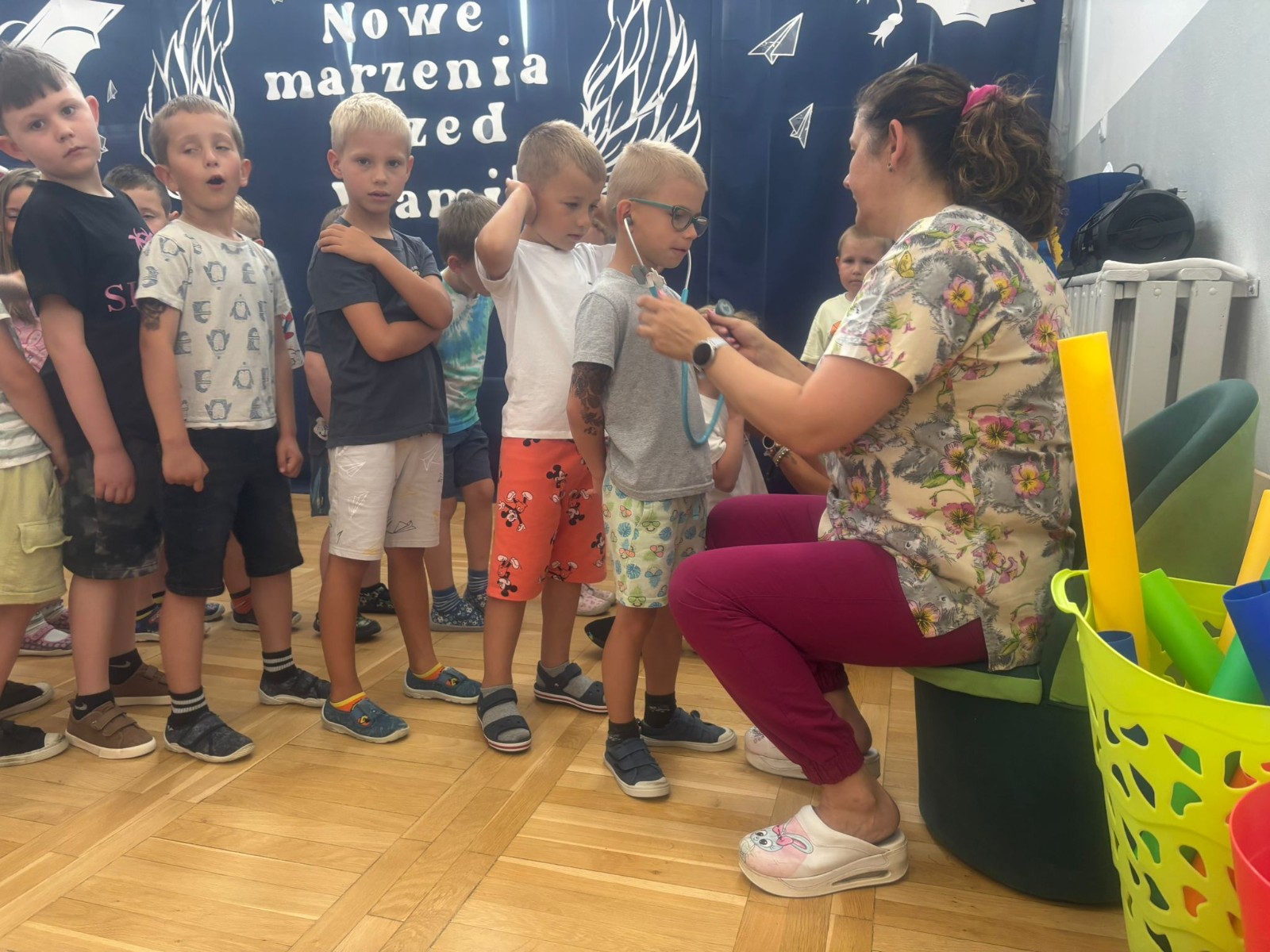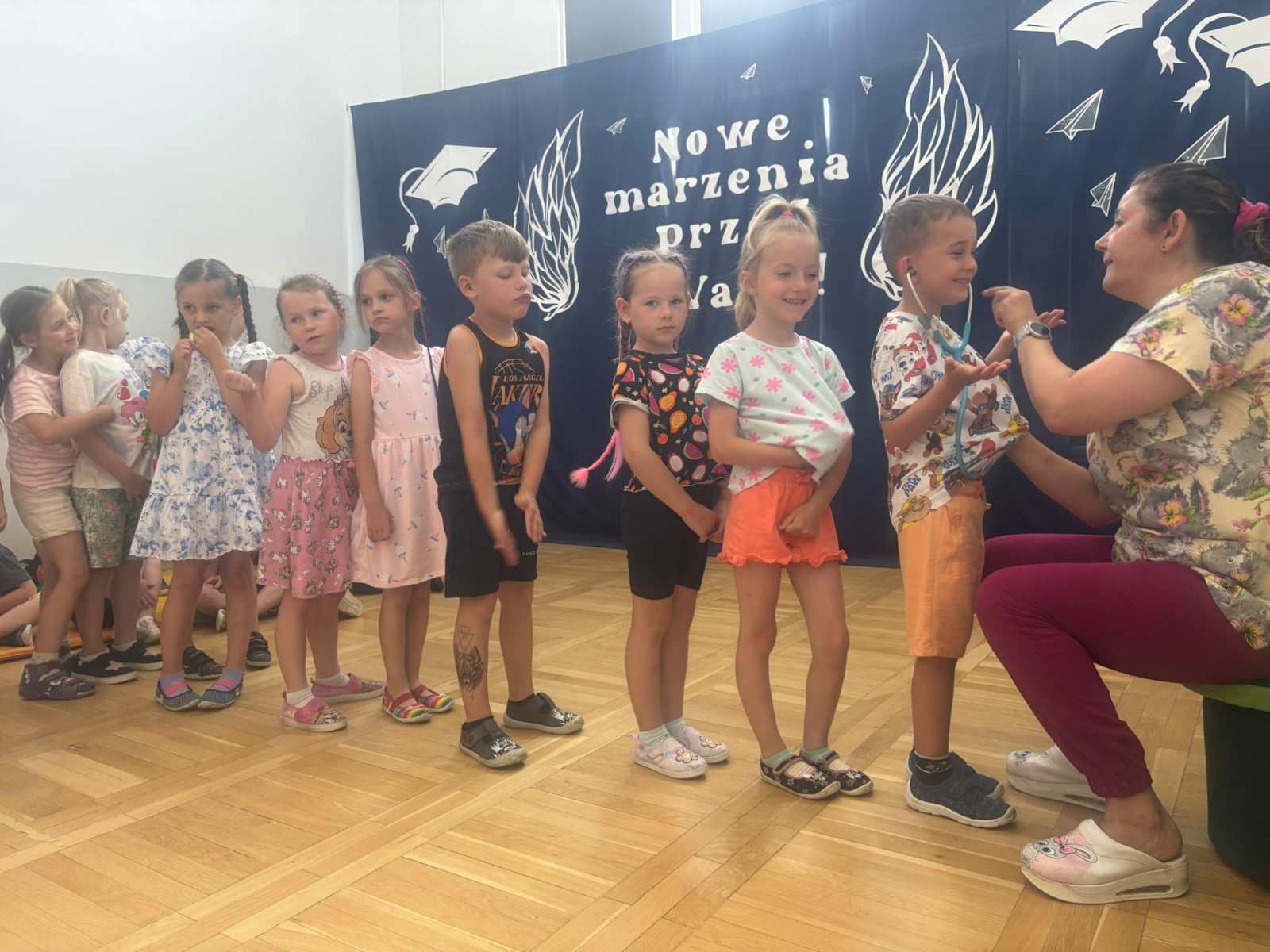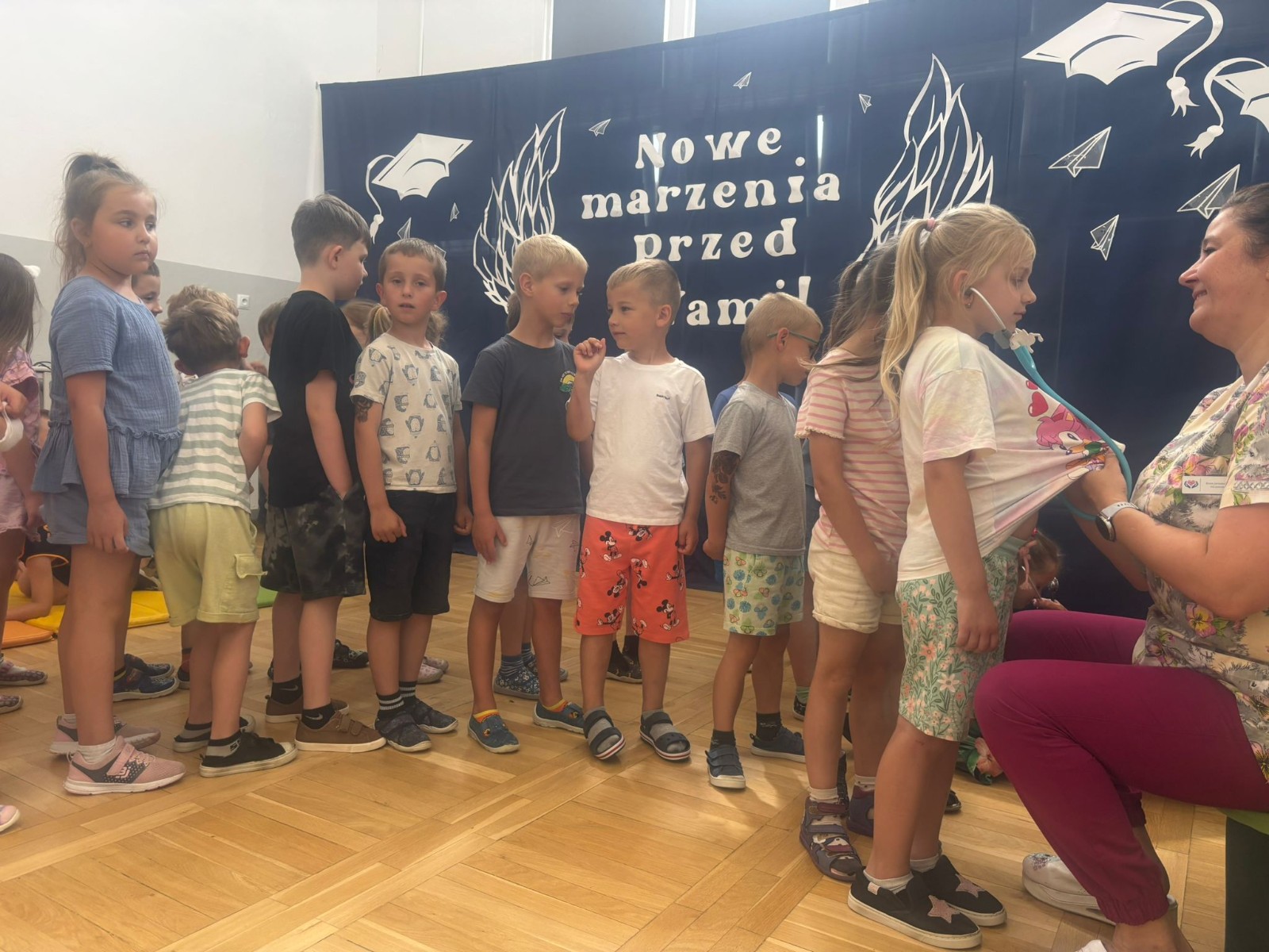 Kolejnym punktem programu była krótka gimnastyka, która miała na celu pokazanie dzieciom, jak ważne jest utrzymywanie aktywności fizycznej w codziennym życiu. Po ćwiczeniach przyszedł czas na prawdziwe „medyczne atrakcje”.