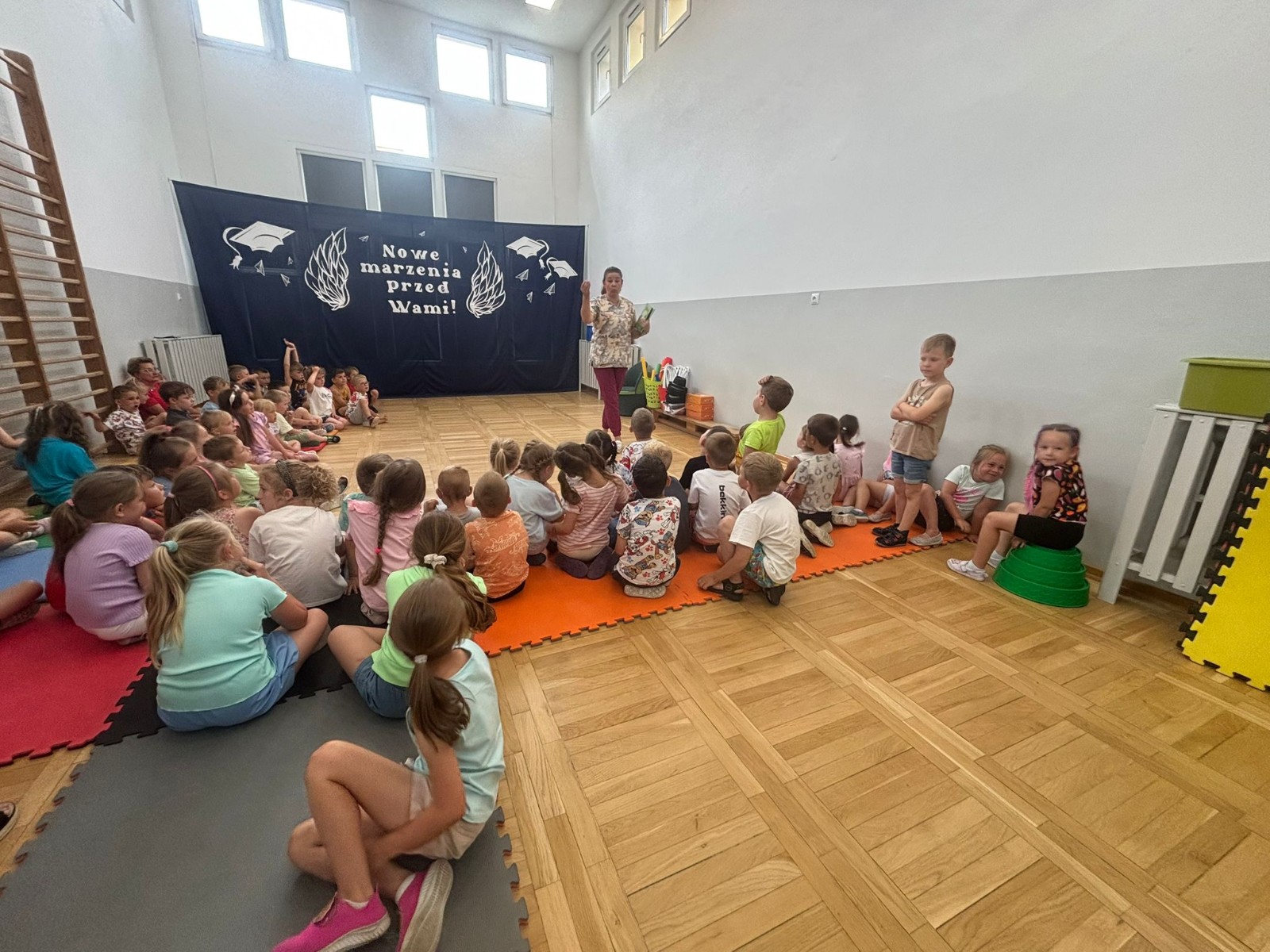 Pani Beatka rozpoczęła spotkanie od przeczytania dzieciom opowiadania, które dotyczyło dbania o zdrowie, prawidłowego odżywiania się oraz znaczenia regularnych ćwiczeń fizycznych.