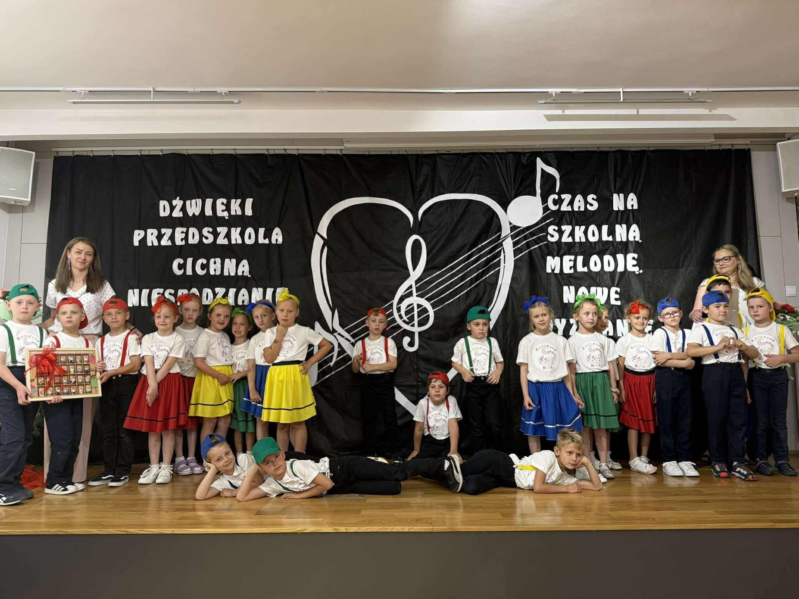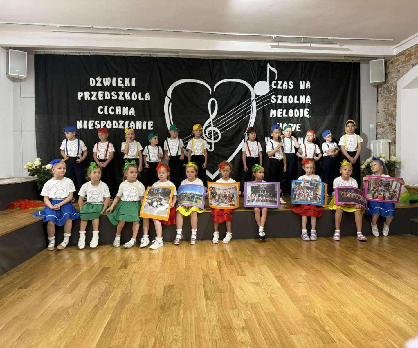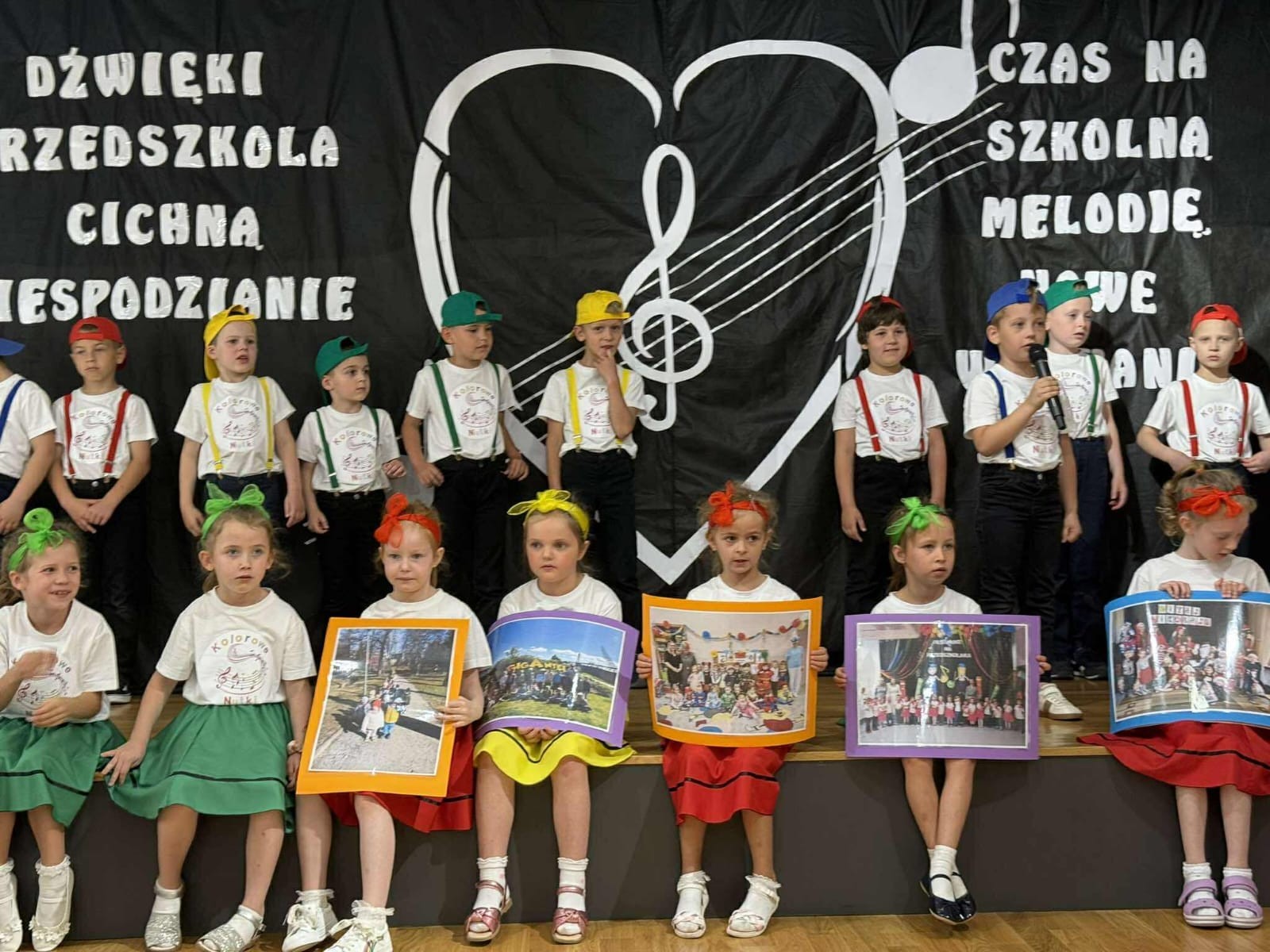 Tymi słowami dzieci z grupy "KOLOROWE NUTKI" pożegnały przedszkole, Panią Dyrektor, grono pedagogiczne oraz wszystkich pracowników przedszkola. Minął czas przygód, zmagań i radosnej zabawy. Zostały piękne wspomnienia, które przywołano podczas przedstawienia na zakończenie roku przedszkolnego. Dzieci wróciły pamięcią do pierwszych chwil spędzonych w przedszkolu, wspólnych wycieczek, występów i zabawnych sytuacji z życia grupy, a przy tym zatańczyły i zaśpiewały wywołując łzy wzruszenia wśród publiczności.