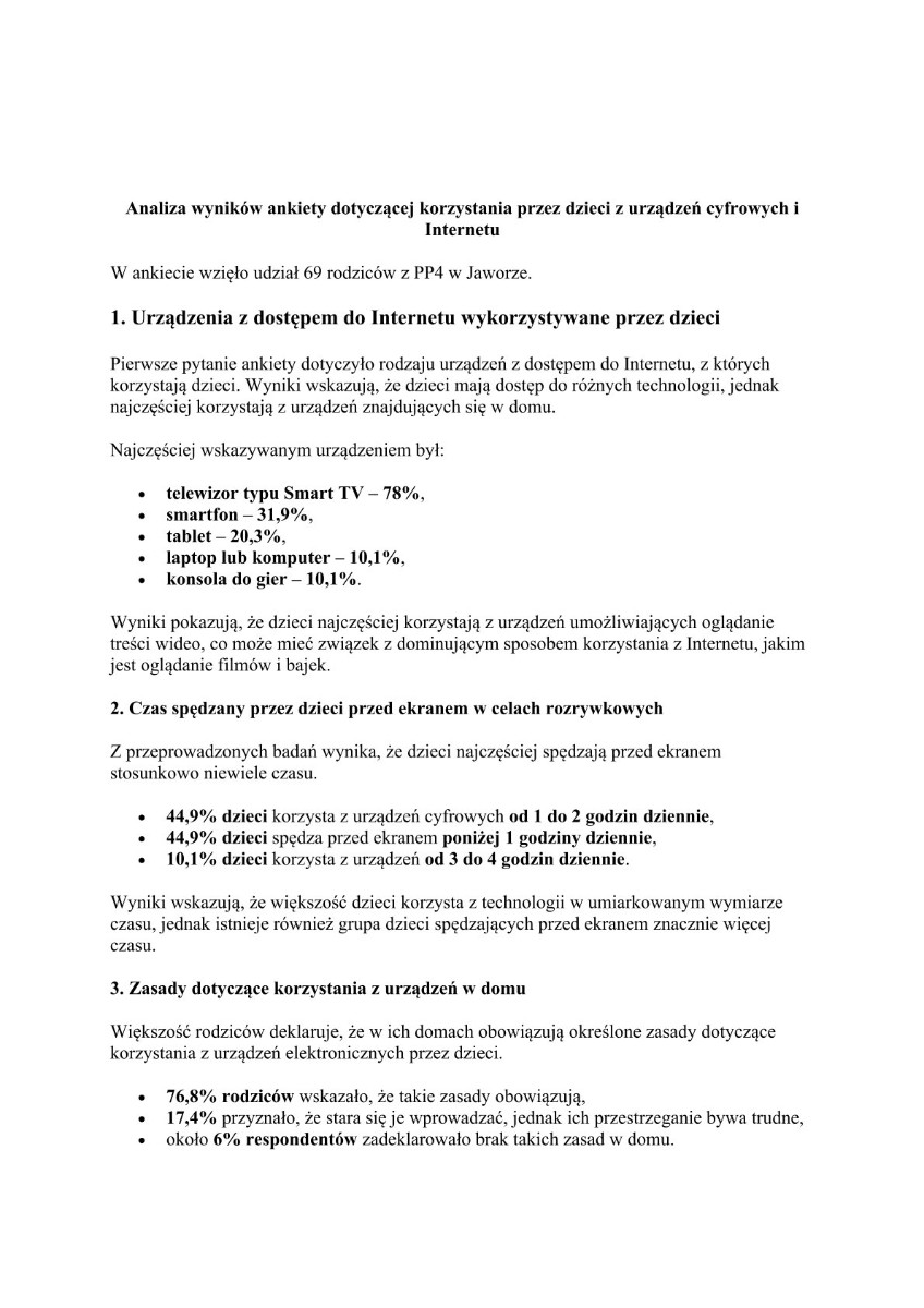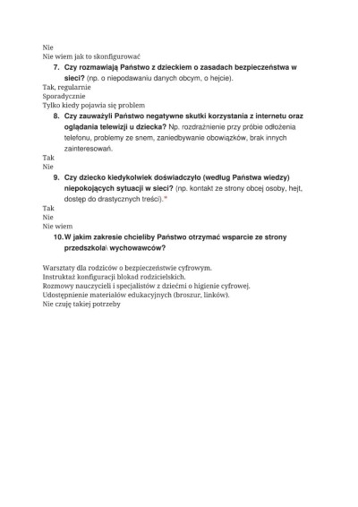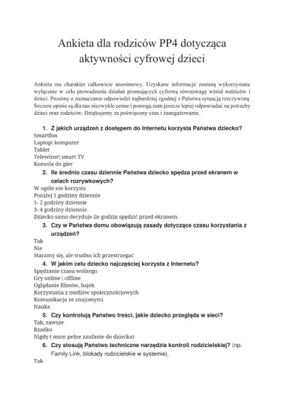 W ramach działań profilaktycznych prowadzonych przez nasze przedszkole, skupionych na bezpiecznym i świadomym korzystaniu z technologii komputerowej, została przeprowadzona ankieta skierowana do rodziców.
