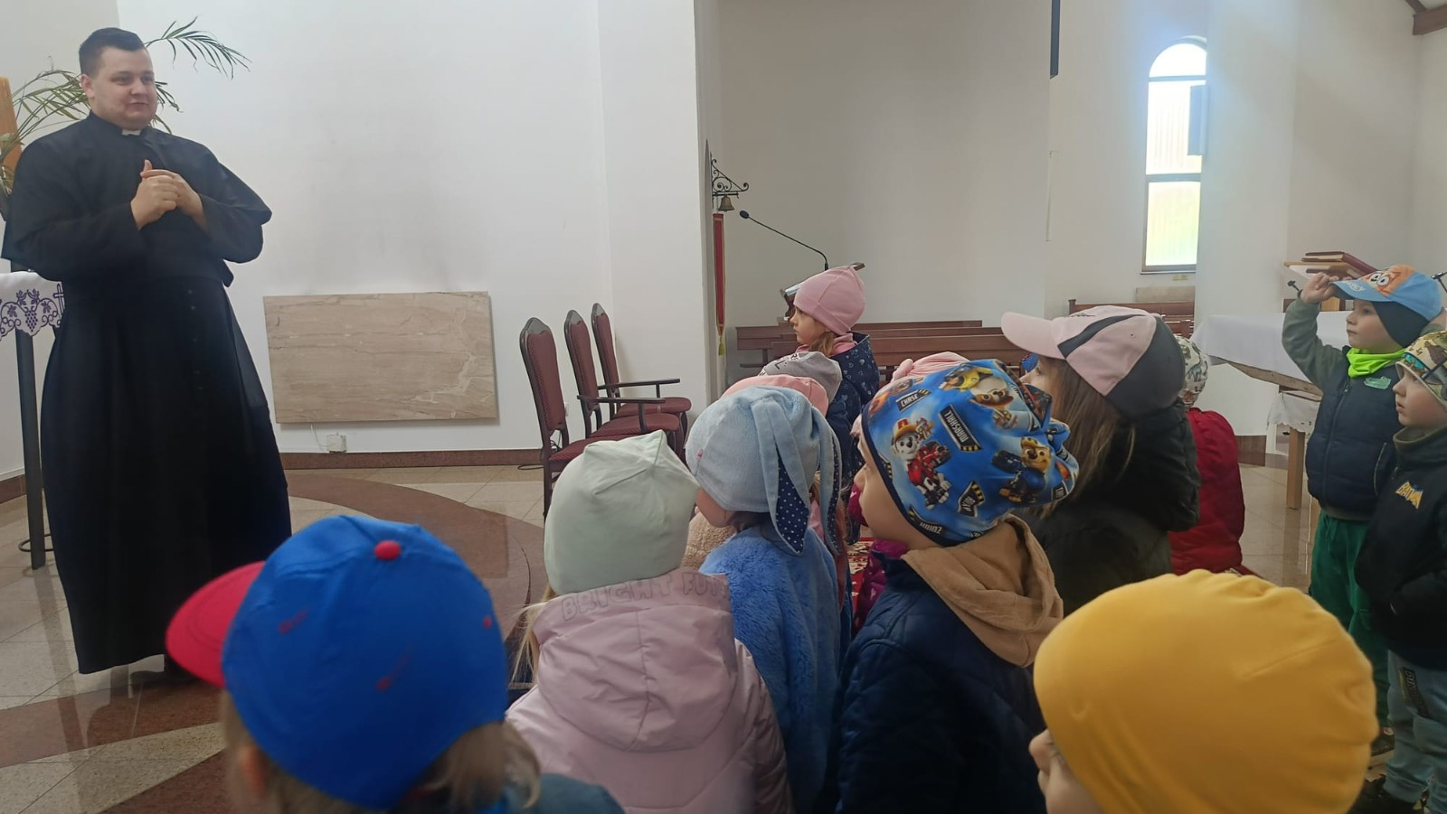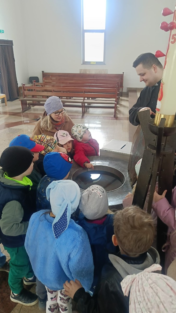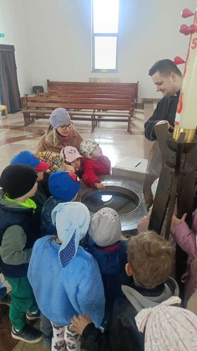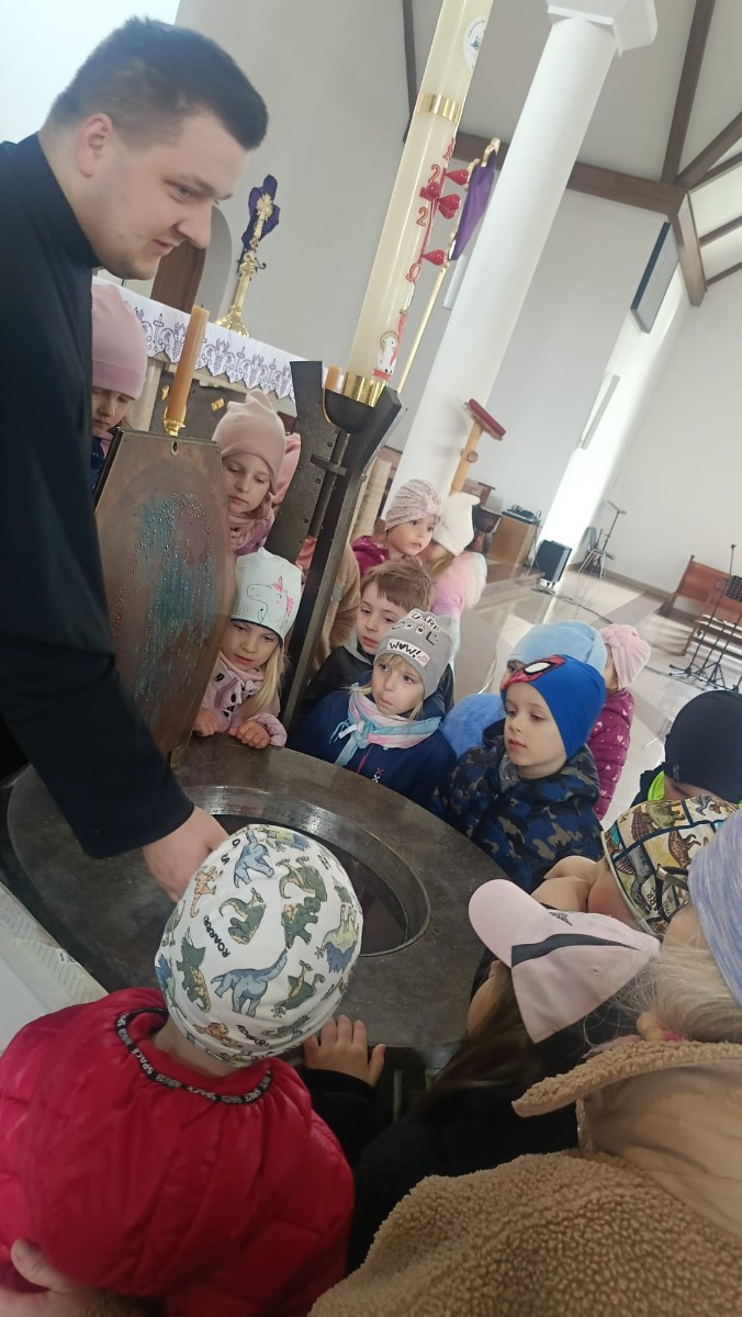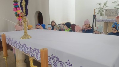 Ksiądz oprowadził dzieci po kościele, opowiadając o jego najważniejszych miejscach. Przedszkolaki miały okazję zobaczyć z bliska m.in. chrzcielnicę, ambonę, ołtarz, konfesjonał oraz tabernakulum. Na zakończenie spotkania zostali zaproszeni do udziału w Niedzieli Palmowej.