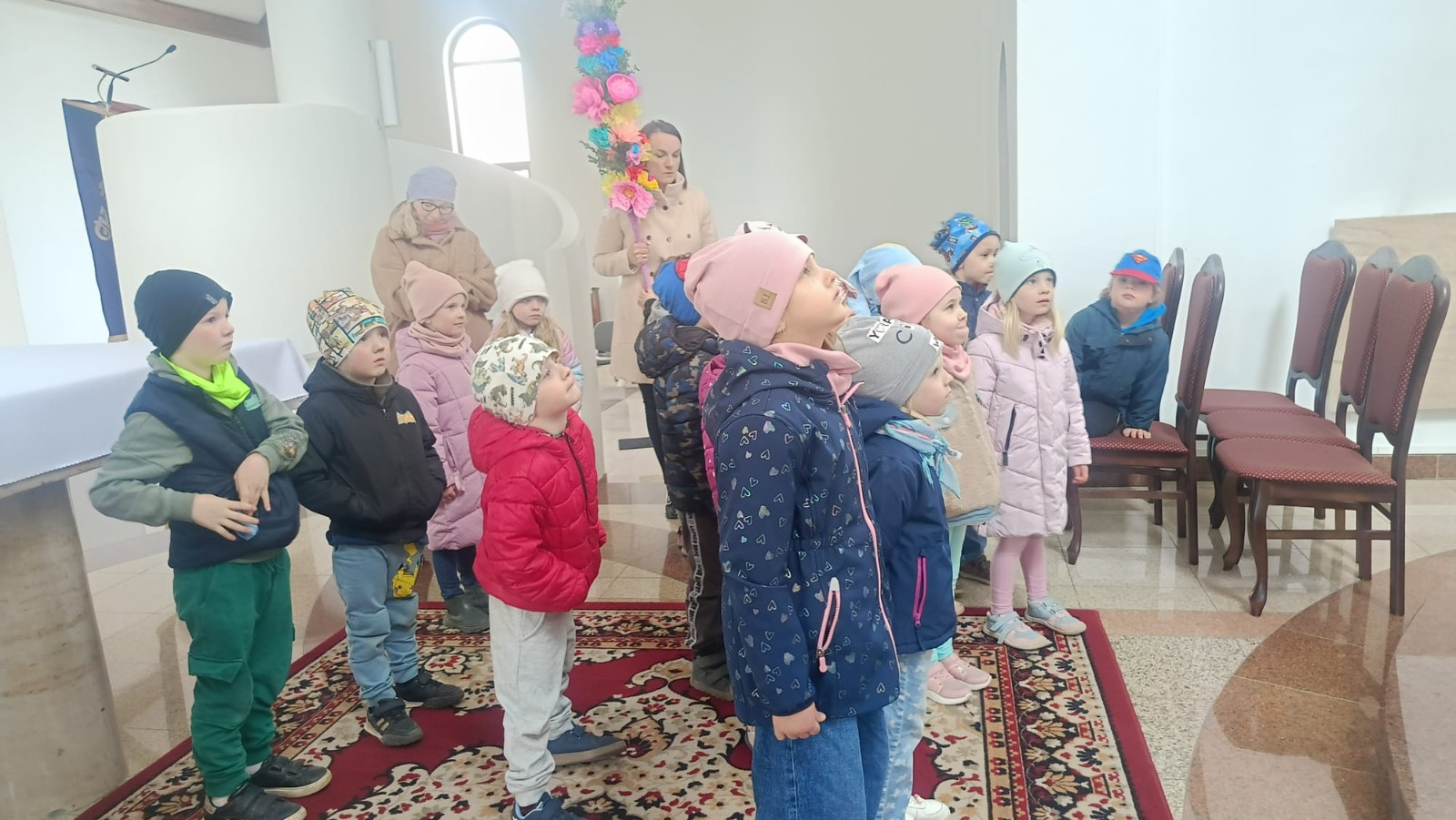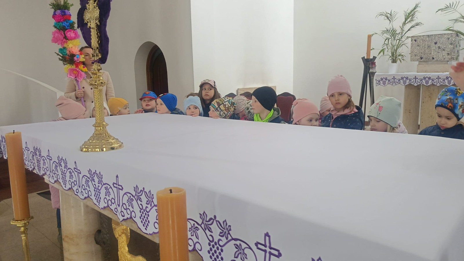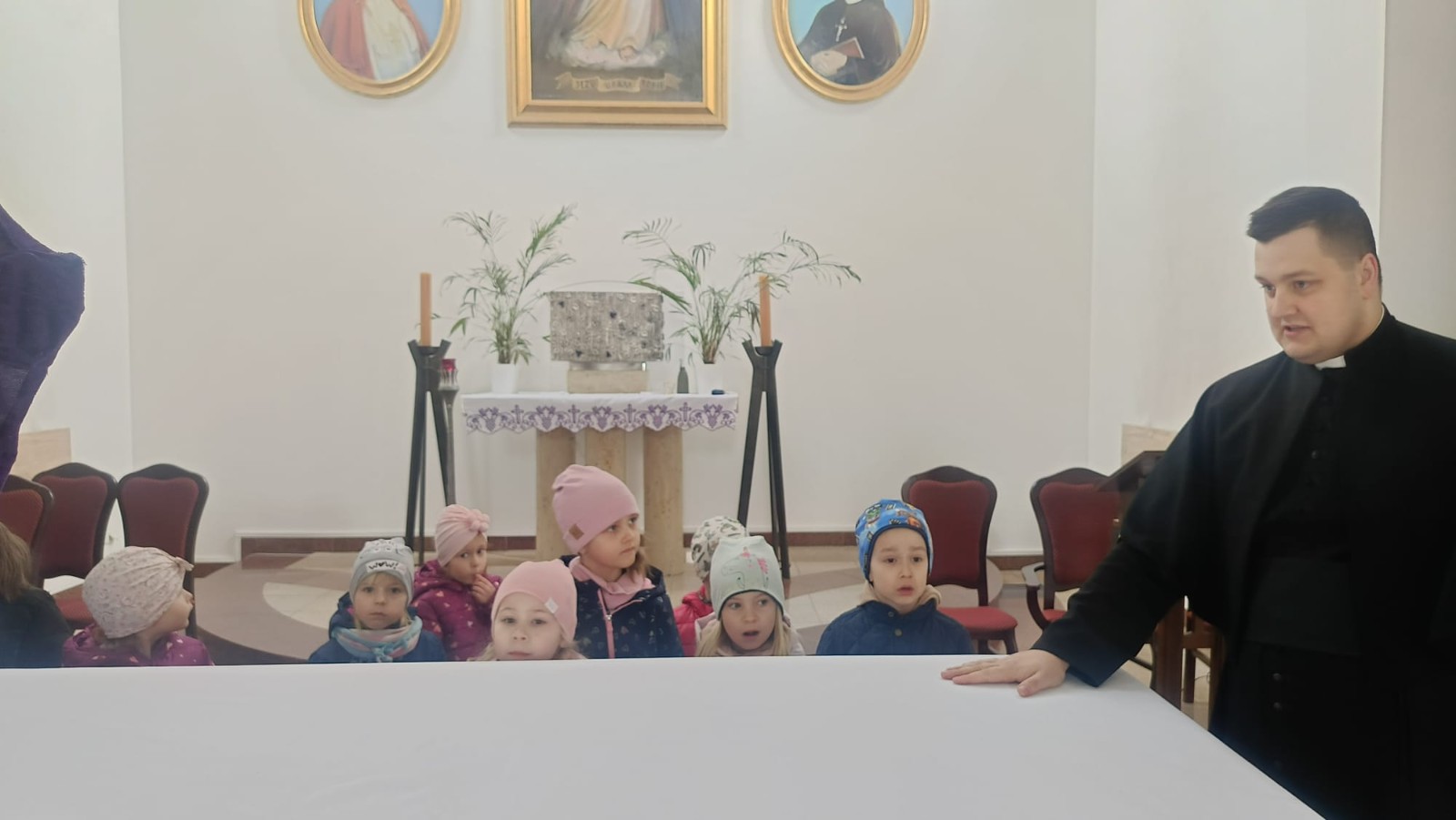 Ksiądz oprowadził dzieci po kościele, opowiadając o jego najważniejszych miejscach. Przedszkolaki miały okazję zobaczyć z bliska m.in. chrzcielnicę, ambonę, ołtarz, konfesjonał oraz tabernakulum. Na zakończenie spotkania zostali zaproszeni do udziału w Niedzieli Palmowej.