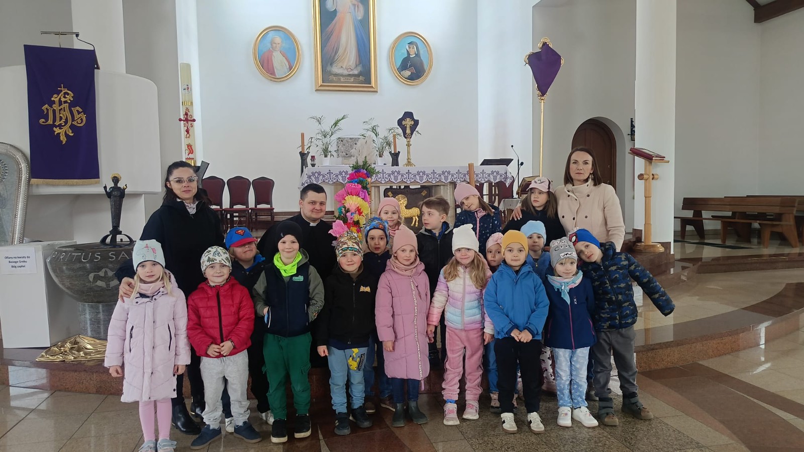 26 marca grupa Fioletowe 1 wybrała się do kościoła św. Faustyny. Towarzyszyła im pani Gosia – nasza katechetka. Na miejscu serdecznie przywitał ich ksiądz Przemek. Dzieci z dumą złożyły własnoręcznie wykonaną palmę wielkanocną oraz kartkę z życzeniami świątecznymi.
