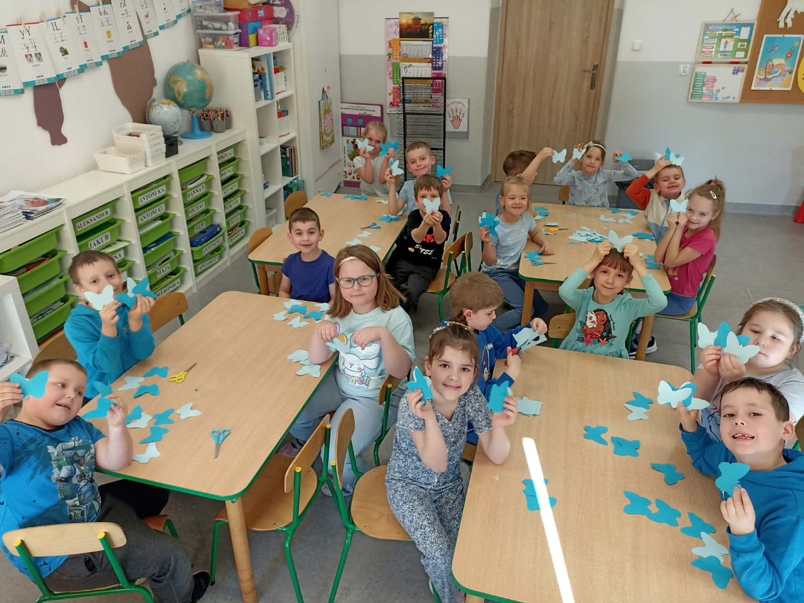 Najważniejszym punktem dnia była wspólna praca plastyczna. Dzieci, pracując w grupach, tworzyły piękne niebieskie serca. Było to nie tylko kreatywne działanie, ale także symbol jedności, empatii i otwartości na drugiego człowieka. Współpraca przy tworzeniu pracy sprawiła dzieciom wiele radości i pozwoliła im poczuć, jak ważne jest działanie razem.